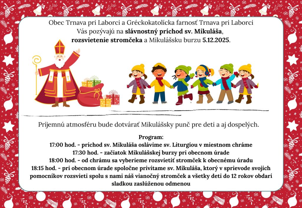 Piatok 5.12. k nám zavíta sv. Mikuláš. Bude s nami sláviť sv. Liturgiu o 17:00. Po nej v sprievode miništrantov a všetkých detí našej farnosti sa zúčastní programu pred obecným úradom, kde naším deťom rozdá aj sladké odmeny.
